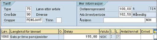Lønnsopplysningene foreslås ut fra den stillingskode som er valgt i IT0001. Her må Type endres til 75, Område til 90 og Gruppe til PENSJAVT.